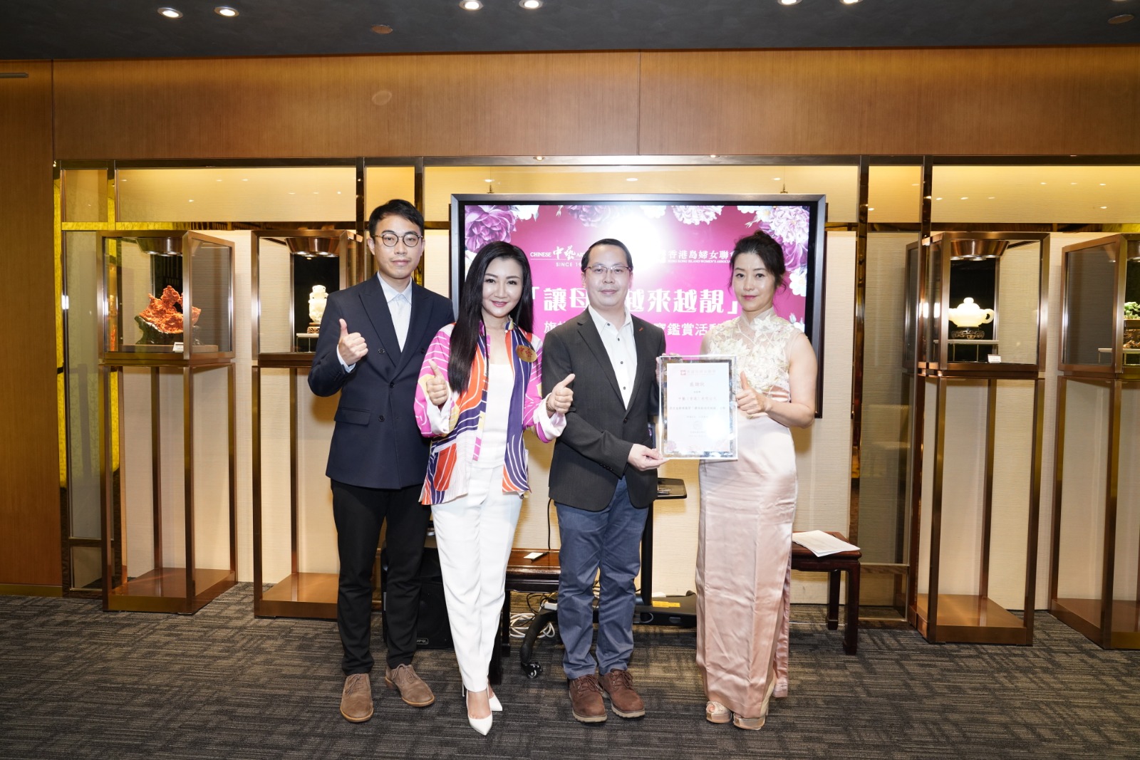 主席金鈴(左二)和首席會長張朱秋慧(右一)向中藝銷售總監謝家耀(右二)致送感謝狀。