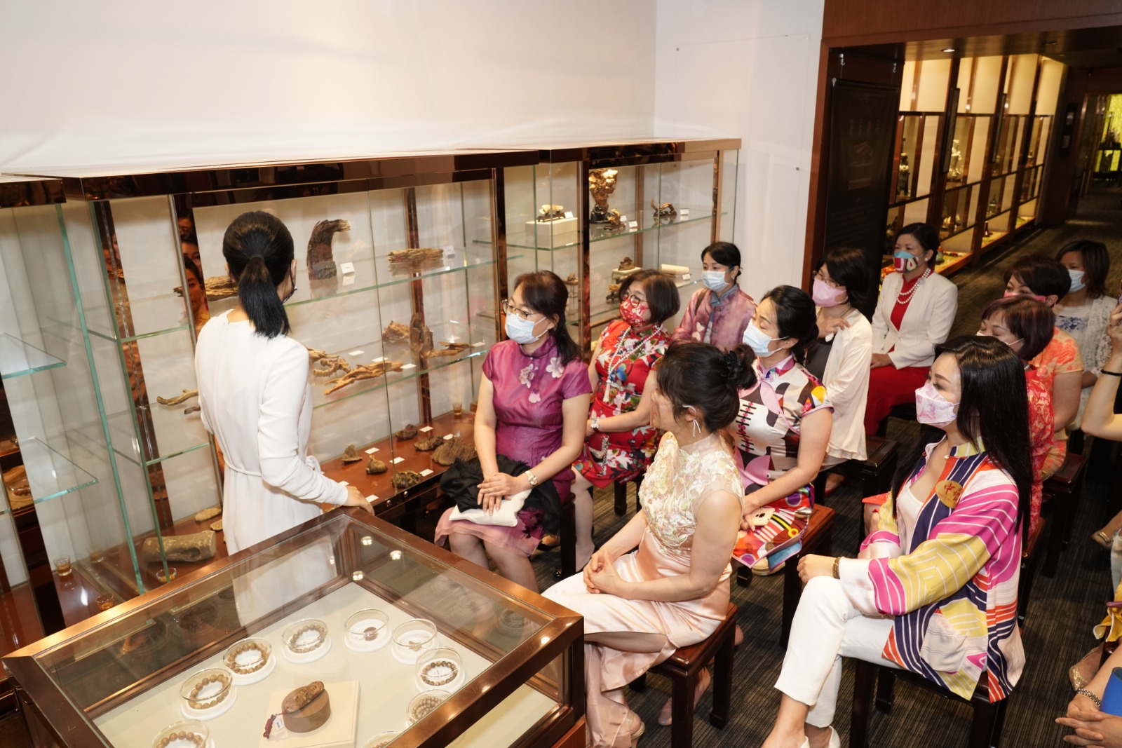 在參觀環節,姊妹們對手繪、真絲、綉花等各種各樣的旗袍讚不絕口,亦對高雅的服裝新區表示讚賞;男士們則對千年的野生沉香結香、野生熟結棋楠及其藥用價值非常感興趣。大家在中藝的灣仔旗艦店久久陶醉在典雅和香味中,身心舒暢,度過了一個難忘的下午。